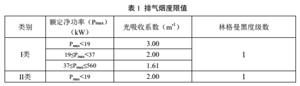 (2)煙度限值:非道路柴油移動機械排氣的不透光法煙度(光吸收系數(shù))和林格曼黑度系數(shù)不應(yīng)超過表1規(guī)定得限值。